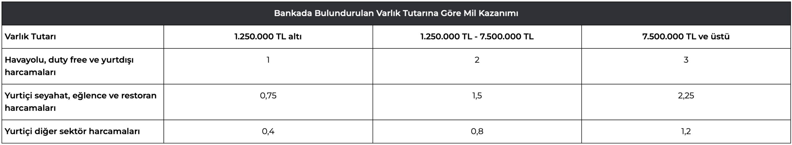 Bankada varlığınız varsa kazanacağınız mil miktarı da varlığınıza göre farklılık gösteriyor. Bankada 7.500.000 TL ve üzeri varlığınız varsa çok iyi mil kazandırdığını söylemek doğru olacaktır.