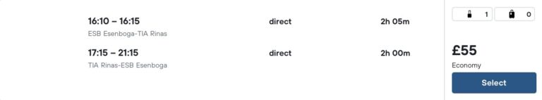 Aşağıda örnek olarak verdiğimiz tarihlere tıkladığınızda tüm fiyatların yüklenmesi için 10 saniye kadar bekleyiniz. Listeden uçuşu seçip “select” butonuna tıklayınız.