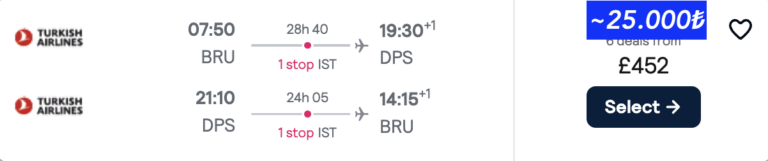 👉 🇧🇪Brüksel – 🇹🇷İstanbul – 🌴🇮🇩BALİ 30kg bagajlı ucuza uçak bileti: 452£ ~ 25.000₺