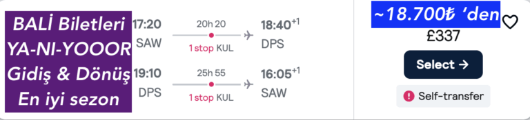📍 İstanbul – Denpasar 🌴🇮🇩BALİ (1 Aktarmalı) TEK YÖN uçak bileti 💸’ 162£~8.955 ₺ den 🔥🔥🔥 YAA-NI-YOOOR