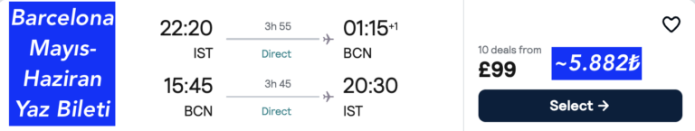 Gidiş & Dönüş >>> 🇹🇷İstanbul – 🇪🇸 Barcelona (İSPANYA) ucuza uçak bileti 99£~5.882₺ 🔥dir.