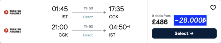 🇹🇷 İstanbul –  🇮🇩 Cakarta | Endonezya | Aktarmasız gidiş dönüş ucuza uçak bileti 486£~28.000₺  🔥🔥🔥
