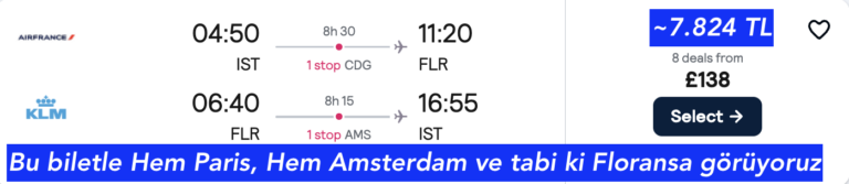 🇹🇷İstanbul – 🇮🇹Floransa (gidiş 🇫🇷Paris’ten, dönüş 🇳🇱Amsterdam’tan aktarmalı) kabin bagajlı 138£~7.824TL 🤌🤌🤌