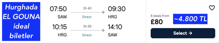🇹🇷 İstanbul – Kapıda Vizeli Hurghada  🇪🇬 Mısır’a aktarmasız gidiş dönüş uçak biletleri 80£~4.800 ₺ ~95£~5.630 ₺ 🔥 arası