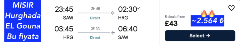🇹🇷 İstanbul – Kapıda Vizeli Hurghada  🇪🇬 Mısır’a aktarmasız gidiş dönüş uçak biletleri 43£~2.564₺ ~95£~5.630 ₺ 🔥 arası