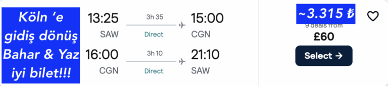 🇹🇷 İstanbul ✈ Köln 🇩🇪 Almanya’ya gidiş dönüş ucuza uçak bileti 60£~3.315₺🔥