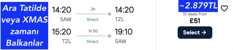 🇹🇷İstanbul – Tuzla 🇧🇦 Bosna-Hersek 51£~2.879₺ den başlıyor. (Araç ile Balkan Turu için ideal tarihler listelenmiştir.)