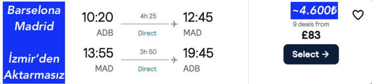 Gidiş & Dönüş >>> 🇹🇷İzmir – 🇪🇸 Barcelona | Madrid  (İSPANYA) ucuza uçak bileti 83£~4.600₺ 🔥den başlıyor.