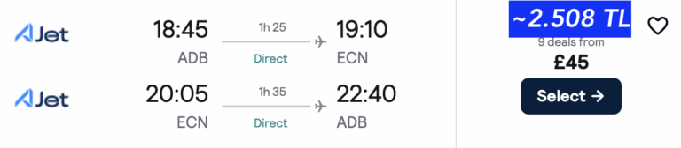 🇹🇷İzmir – Lefkoşa (K.K.T.C) gidiş dönüş Aktarmasız ucuza uçak bileti 45£ ~ 2.508₺🔥