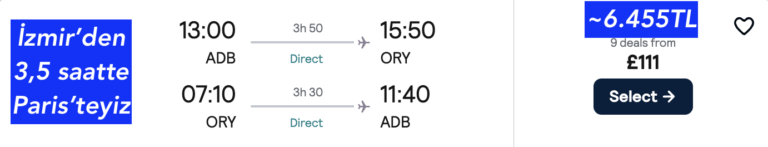 🇹🇷 İzmir ✈ Paris 🇫🇷 Fransa’ya kabin alınabilen 10kg sırt çantalı gidiş dönüş ucuza uçak bileti 111£~6.455₺ 🔥