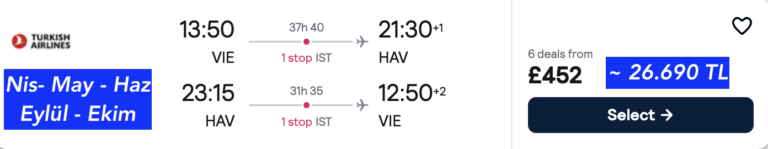 THY ile 🇦🇹Viyana – İstanbul – Havana🇨🇺Küba IST aktarmalı gidiş dönüş ucuza uçak bileti 452£~ 26.690₺
