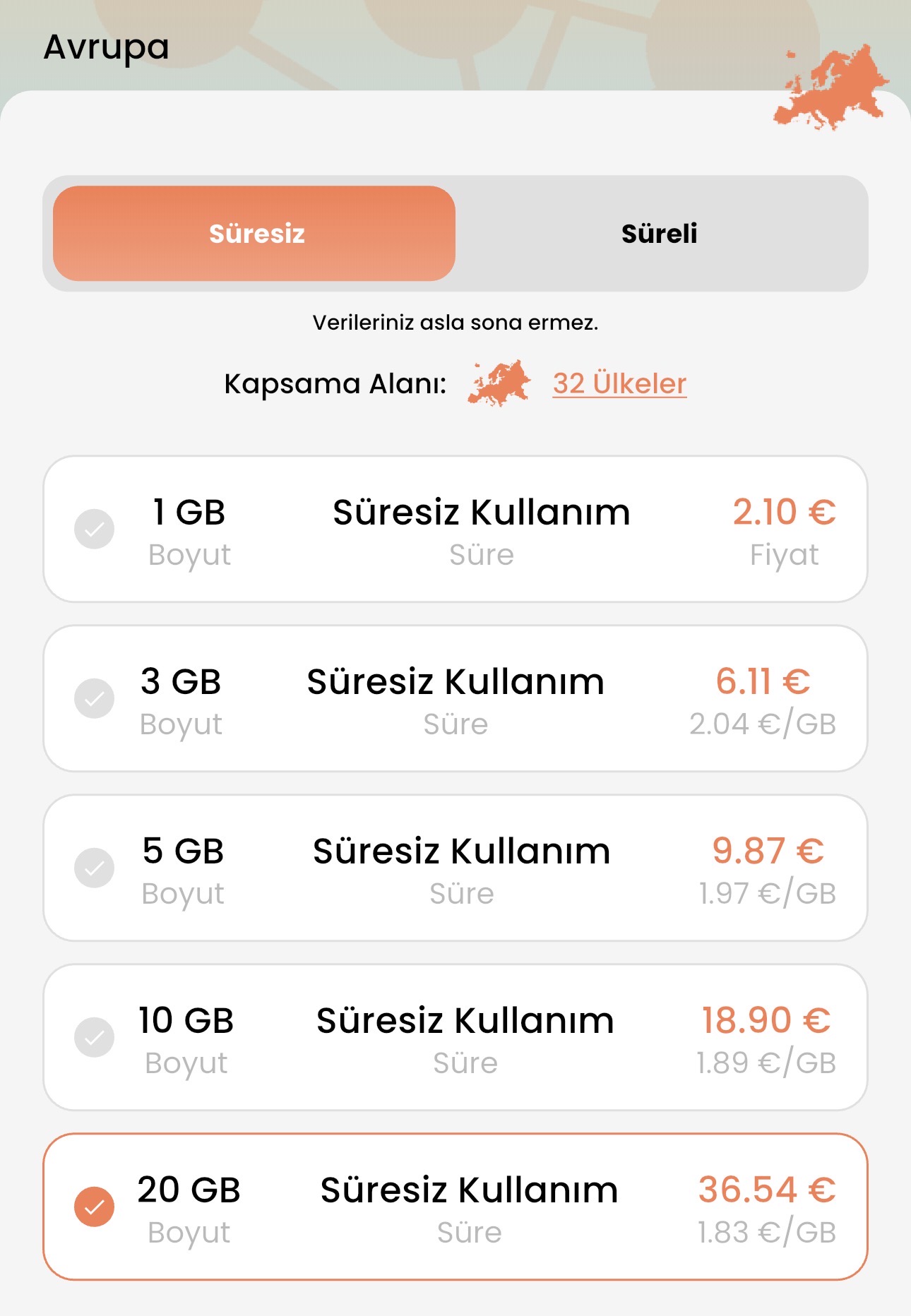 | Türkiye | 20GB | 7.97€ | 11.39€ | 30 gün |